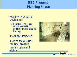 - Purchase PPE and decontamination equipment and train frequently utilizing this equipment to protect the safety of the hospital provider. All training and materials used must conform to OSHA standards and regulations. Routine protective gear (such as goggles, surgical facemask, gloves, and gown) may not offer sufficient protection in all circumstances (that is, nerve agent attack). Levels of PPE will be determined by the local jurisdiction. - Develop adequate caches of antidotes that are readily available to quickly and accurately treat victims of a chemical attack. EDs should maintain basic treatment guidelines for the types of NBC events likely to be seen. Summarizing this information on treatment cards or posters helps to regularly reinforce the information while streamlining the delivery of medical care. - Develop a plan to ensure security of the hospital during a terrorist or disaster event. Emergency backup phone and communication systems need to be in place. Identifying alternative sites for providing medical care to patients with minor problems will help ensure continual access to healthcare. |