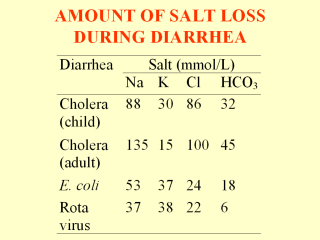 | The amount of salt and water loss resulting in dehydration is higher in patients with cholera than other types of diarrhea (Molla et al. 1981). However, loss of potassium is higher and loss of other salts is lower in rotavirus diarrhea compared to other diarrheal diseases. Therefore, kids who commonly suffer from rotavirus diarrhea should be given extra plain water and/or breast-milk in between ORS to prevent hypernatremia (a salt overload). |
