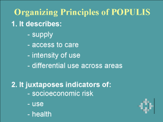 where the service is obtained. Measuring intensity of service use can be used to make comparisons within or among regions: variations in use of different hospitals, relative use of resource-intensive vs. less intensive procedures, and usage patterns of regions with similar health status. 2. The initial focus is on one of the most important factors, socioeconomic determinants of health, and their relation to utilization, supply, and health status indicators. |