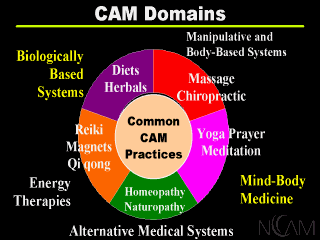 manipulation. Energy therapies, involving things that are truly based on energies with electromagnetic radiation, such as magnets and electro-acupuncture, and things that are purporting to work through energy, such as reiki and qi gong and other forms of Asian health care practices. There are mind-body approaches of which many are within the field of CAM, including yoga and meditation. And there are whole systems that exist as parallel health care universes we call alternative medical systems. Some of which are ancient -- ayurvedic medicine from India, traditional Chinese medicine -- as well as things in the past two centuries that evolved in Europe and the United States, such as naturopathic medicine and homeopathy. |