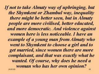 Inequality and, therefore, favourable condition for violence is more common to the south, where traditions are better preserved and followed. Shymkent is one of such cities in the south.