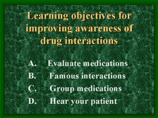 purposes of this lecture we’ll consider 12 medications. B. Famous interactions (the 12 medications considered were chosen because they have some rather archetypal interactions!) C. Group medications (branching out from the 12 closely studied medications inferences can be drawn regarding similar medications) D. Hear your patient (because of the vast number of potential drug interactions new ones are being discovered every day…..but only if one listens carefully to patients’ descriptions of adverse reactions that they have experienced after adding a new drug to their regimen.) |