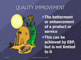 Quality improvement is a continuous process that builds upon traditional quality assurance methods by emphasizing the organization and focuses on “processes” rather than on the individual; recognizes both internal and external “customers;” promotes the need for objective data to analyze and improve processes; carried out by both employees and managers. Although this may be achieved by EBP, it is often achieved by the collection of raw data on patient outcomes, sentinel events, negative clinical outcomes or errors from an institution or organization. This data is often specific to the institution or organization.