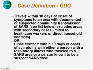 documented or suspected community transmission of SARS * Close contact is defined as having cared for, having lived with, or having direct contact with respiratory secretions and/or body fluids of a patient known to be suspect SARS case. Note: Suspect cases with either radiographic evidence of pneumonia or respiratory distress syndrome; or evidence of unexplained respiratory distress syndrome by autopsy are designated "probable" cases by the WHO case definition. |