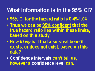 Let us look at why the results have been misinterpreted. The 95% CI for the hazard ratio is 0.49-1.04: thus we are 95% confident that the true hazard ratio lies within these limits. That is all the 95% CI tells us. It does not tell us how likely it is that a survival benefit exists (or does not exist). Thus the authors make an erroneous conclusion because the tools they used could not answer their question. |