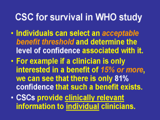 Clinical significance curves are formed by calculating the level of confidence associated with any magnitude of benefit or detriment. Individuals can select an acceptable benefit threshold and determine the level of confidence associated with it. For example if a clinician is only interested in a benefit of 15% or more, we can see that there is only 81% confidence that such a benefit exists. CSCs provide clinically relevant information to individual clinicians. The information contained in the curve can be displayed in tabular form instead. Such information is not available when using P values or confidence intervals. |