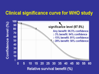 This is a clinical significance curve for the WHO study (the curve is thick to project better, however obviously thinner curves are required for accurate calculations).. A clinician can select a benefit which they would accept before implementing treatment, and can see the level of confidence associated with it. For example if a clinician is only interested in a survival benefit of 15%, you can see that this is associated with a confidence level of only 80%. This type of curve can be constructed for any comparison, whether it is survival, local control or toxicity, and whether the results are absolute or relative. Alternatively, results can also be tabulated. In fact, if one has results for survival and results for toxicity, they can be combined. I will show this with the next example, the Intergroup study 0099 for nasopharyngeal carcinoma. |