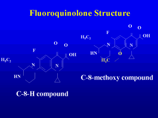 | We obtained half a dozen investigational compounds from John Domagala, and we began to test them for activity with resistant gyrase mutants of E. coli and M. bovis BCG. The slide shows one pair of compounds that differ only in the presence (or absence) of a C-8 methoxy group. |