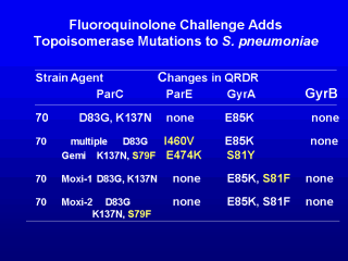 | S. pneumoniae can acquire many fluoroquinolone resistance mutations. On this slide we show up to seven that were obtained by repeated challenge of two clinical isolates (15). The point is that as long as we require the bacteria to obtain only one more mutation to be resistant, the bacteria will readily make new fluoroquinolones obsolete. This is why we must force them to attain at least two mutations for resistant growth. |