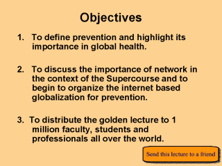 “Knowledge is sharing” We would like for this lecture to be distributed or “SPAMED” to 1,000,000 people world wide. Feel free forward this lecture to as many people as possible and please let us know who the recipients were. If you have any thoughts about distribution channels for this lecture, share them with the Supercourse group (super2@pitt.edu). To join the Supercourse, please visit www.pitt.edu/~super1/ or e-mail super2@pitt.edu. Membership in the Global Health Network Supercourse will allow you to receive free Supercourse CDs, just in time lecture, and annual prevention lectures Note: “Send this lecture to a friend” button works from PowerPoint slide show mode. |