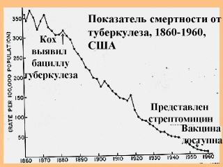 детерминанты болезни. Показатель смертности от туберкулеза начал падать в начале 19-ого столетия и продолжил устойчивое падение намного раньше открытие эффективных режимов лечения, фактически искоренив болезнь среди обеспеченных популяций в 1950-х. Прогресс вел к улучшению жилищных условий и лучшему питанию. Улучшалась грамотность. Стало менее принятым для нескольких детей в семействе спать в одной кровати. Хорошее питание, улучшение жилищных условий, достаточная осведомленность и изолированность в доме (для уменьшения вероятности передачи от человека к человеку инфекции), все это помогло уменьшить преждевременную смертность. Возможно было также повышение естественного (от матери к младенцу) уровня иммунитета к некоторым из заразных болезней, которые уносили огромное количество младенцев и детей, и снижение вирулентности некоторых из наиболее смертельных патогенов. |