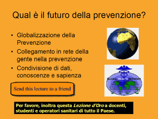 Come unirvi al Global Health Network? Dopo aver visto questa presentazione, per favore, trasmettetela ad altre persone o liste. Vogliamo che "infettiate" i vostri amici e tutto il Paese con la prevenzione basata su Internet. Per partecipare al progetto Supercourse del Global Health Network, mandate i vostri dati attraverso il sito http://www.pitt.edu/~super1/assist/join.htm oppure scrivete a Noi, al progetto Supercourse aspettiamo di collaborare con voi! Dice l’antico proverbio cinese: "Il viaggio di mille miglia comincia con un passo" (Chandra Pandav, India). Questa presentazione rappresenta un primo passo di future lezioni sulla prevenzione che il gruppo di Supercourse distribuirà tutti gli anni. Nota:, il bottone arancione "send this lecture to a friend" funziona dalla presentazione e permette di inoltrare al altri questa lezione |