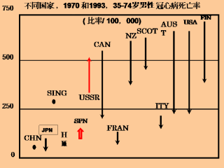幻灯片显示, 与许多其它国家不同, 前苏联国家的冠心病死亡率成上升趋势。这种上升趋势主要是因为前苏联的公共卫生系统的崩溃。