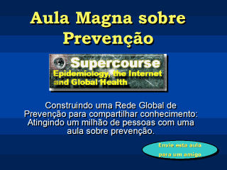 "Uma onça de prevenção vale uma libra de cura" O valor da prevenção primária é conhecido pela humanidade há séculos. Infelizmente, ainda hoje os benefícios não são totalmente reconhecidos, devido à preocupação excessiva com a moderna tecnologia médica. Nós do projeto Supercourse (www.pitt.edu/~super1) decidimos salientar a importância da prevenção desenvolvendo esta "Aula Magna sobre Prevenção". O Supercourse, instituído pela National Library of Medicine, é um curso via Internet contendo aulas sobre prevenção e saúde pública, disponibilizado gratuitamente por 10.000 membros de 151 países da Rede Global de Saúde. Desenvolvemos a Aula Magna sobre Prevenção para enaltecer o papel da prevenção no esforço em manter nosso planeta saudável. Observação: O botão "envie esta aula para um amigo" funciona apenas no modo de exibição de slides do PowerPoint. Esta aula foi criada por Faina Linkov, MPH com a ajuda da equipe do Supercourse em Pittsburgh (EUA) e da Rede Global de Saúde. Lecture was translated by Dr. Luis Gerk de Azevedo Quadros |