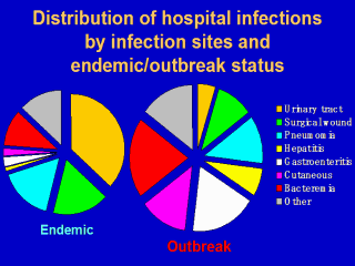 Outbreak pathogens are different from endemic pathogens. Hepatitis, gastroenteritis, cutaneous infections, bacteremia are more common in outbreaks than in endemic infections.