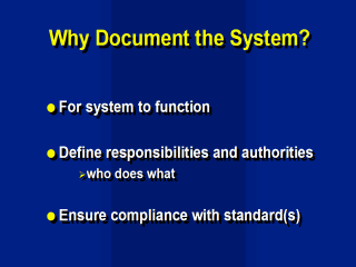 require a system of QMS documentation. The QMS documentation needs to show in some manner who is responsible for the various functions of the organisation. Such documentation of responsibilities and authorities need not be unnecessarily detailed, but is should be sufficient to ensure that there is no ambiguity about major areas of responsibility. |