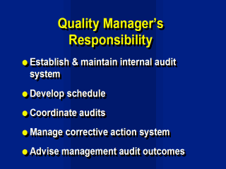 To establish a program, the Quality Manager will need to develop and document auditing procedures, establish auditing schedules, select and train internal auditors and develop audit report and corrective action forms. To maintain the program after its establishment the Quality Manager will coordinate the audits using the schedule, and ensure their timely delivery. Corrective action system must be monitored and maintained. Management must be regularly advised of audit outcomes. |