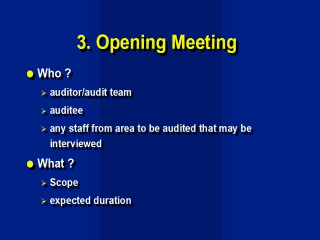| The manager of the area to be audited and staff members which will be involved in the audit should be included in the opening meeting. At this point the auditor or lead auditor will reiterate the scope and expected duration of the audit. |