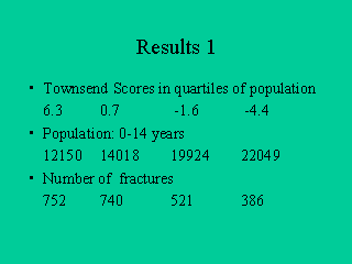 This slide shows the distribution of Townsend scores, childhood populations and the number of fractures for the area quartiles.