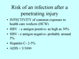 The INFECTIVITY of the three most common infections to health care workers (HCW) by penetrating injury. Infectivity is the risk of infection after exposure. Hepatitis B has the highest infectivity, whereas AIDS has the lowest infectivity. Hepatitis C has an intermediate infectivity of 2-5%. |