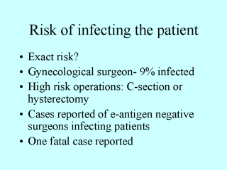 The exact risk of infection to the patient cannot be calculated. It probably varies according to the type of surgery, surgical technique and possibly variable infectivity of the surgeon. One gynecological surgeon infected 9% of 247 patients (Welch J et al, Lancet 1989; 1:205). There are case studies of e antigen negative surgeons who infected their patients and one case of a fatal outcome after the patient developed fulminent hepatitis (Sundkvist T et al. Commun Dis Public Health 1998; 1:48). |