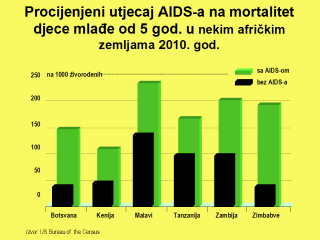 U posljednje dvije decenije prevencija epidemija HIV/AIDS-a postala je pravi izazov za javno zdravstvo. Budući da još nema djelotvornog lijeka, a postojeći načini liječenja nisu svima dostupni, prevencija zaraze je najbolji način izbjegavanja visokog morbiditeta i mortaliteta uzrokovanog AIDS-om. Zemlje koje su zahvaljujući službama za antenatalnu skrb, oralnoj rehidraciji, zdravoj vodi i programima cijepljenja postigle nisku smrtnost dojenčadi, tj. manju od 50/1000, kao što je to u Zimbabveu i Botsvani, suočene su s najnegativnijim utjecajem - mortalitetom u skupini djece mlađe od pet godina povećanim čak 4-7 puta. U zemljama gdje je opći mortalitet djece visok usljed drugih uzroka, mortalitet uzrokovan AIDS-om je gotovo podvostručen. Autor slajda: Marc Bulterys, MD, PhD |