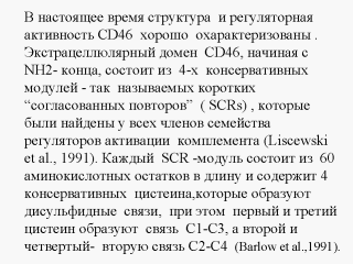 | Единичный SCR- модуль формирует третичную бета-структуру с компактным ядром и некоторым количесством менее консервативных участков, способных связываться с другими белками. Обнаружено, что SCR- модули не расположены в строго линейной последовательности . Каждые два из четырех SCR- модулей формируют угол около 100 градусов с небольшим закручиванием относительно длинной оси модуля ( Barlow et al., 1993; Molina et al., 1995). |