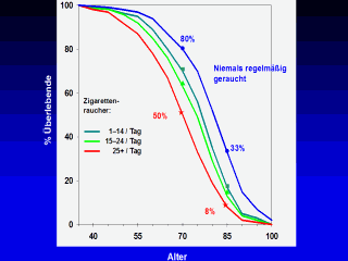 Quelle: Doll R, Peto R, Wheatley K et al. Mortality in relation to smoking. BMJ 1994; 309: 901–911 |