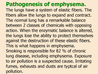 an inherited lack of a protective protein called alpha 1-antitrypsin (AAT). Emphysema begins with the destruction of air sacs (alveoli) in the lungs where oxygen from the air is exchanged for carbon dioxide in the blood. The walls of the air sacs are thin and fragile. Damage to the air sacs is irreversible and results in permanent spaces in the tissues of the lower lungs. As air sacs are destroyed, the lungs are able to transfer less and less oxygen to the bloodstream, causing shortness of breath. The lungs also lose their elasticity. The patient could experience difficulty exhaling. Emphysema develops very gradually. Years of exposure to the irritation of cigarette smoke usually precede the development of emphysema. Also, some people may have had chronic bronchitis before developing emphysema. |
