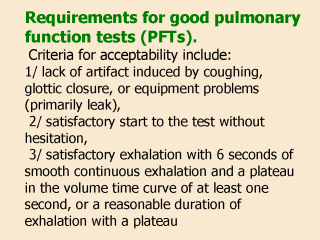 | Criteria for reproducibility after obtaining 3 acceptable spirograms include: 1/ largest FVC within 0.2 L of next largest FVC, 2/ largest FEV1 within 0.2 L of next largest FEV1 and 3/ if the 2 above criteria have not been met, additional spirograms should be obtained. |