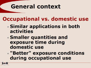 applications. On the one hand, the amount of product used in domestic application is usually small and the exposure time is limited. On the other hand, the exposure conditions may be poor (no ventilation, no protective equipment). It must be pointed out that some occupational applications may be also performed in poor exposure conditions. This is for instance the case of field activities such as tiles waterproofing. |