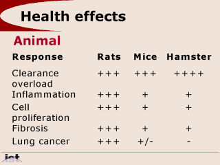 This slide shows the animal species differences for some health effects of diesel exhaust. Due to the striking differences between species, it is not sure how these results can be extrapolated to humans. |