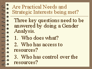 to gather information. This information is commonly referred to as a Gender Analysis. The information collected should come from the first person. Information gathered second or third hand becomes less and less valuable. If practical needs and strategic interests are not being met one can usually determine why not after answering the above 3 questions. |