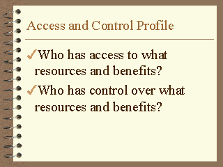 be equitable across gender lines. For example, women may have access to land for growing crops, but may not have control over the actual land. This can have obviously negative consequences. |