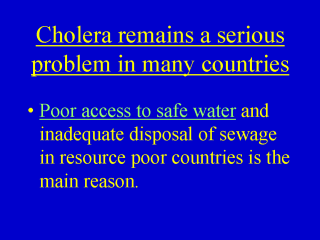 Despite our knowledge of the cause of cholera a high proportion of the world’s population still does not have access to safe water or facilities for disposal of excreta. This allows epidemics to continue to spread. The link is to a British Charity - WATERAID which is trying to help with this problem.