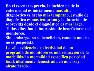 Mamografía 1. Menos de 50 años, sensibilidad es 75%, desúés de 50 años, la sensibilidad es de 90%. 2. Menos de 50 años, 640 mamografías anormales se confirmaron con cáncer; la razón FP/TP es 623/17 = 36.7. Sobre 50, 100 mamografías anormales se confirmaron 14 anceres; razón FP/TP es 86/14 = 6.1. Expresando esas como valores predictivos positivos, tenemos 17/640 = 2.7% y 14/100 = 14%., respectivamente. 3. Menos de 50, incidencia es 1.42/1,000/año (basado en 1/70 en 10 años, o 1/700/año) y mortalidad es 0.37/1,000/año (basado en 37 muertes en 10,000 en 10 años). Sobre 50, incidencia - 2.5/1,000/año (basado en 1/40/10 años). Mortalidad – 0.67/1,000/año (basado en 1/150 en 10 años). Go to the main page of the course