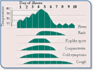 | Measles as a disease. Beginning like a bad cold, the child develops a fever and a rash. The patient always feels miserable and may be ill with a bad cough and a high temperature. Measles can cause encephalitis, sometimes resulting in brain damage. It can also cause convulsions, ear infections, bronchitis and pneumonia that can lead to longterm lung troubles. The course of measles symptoms is shown in the diagram. |