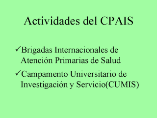 El CPAIS está conformado por estudiantes universitarios Latinoamericanos. Se tiene una directiva compuesta de Dirección General, Coordinador de Difusión, Fiscal Científica y Coordinadores de Proyectos. Las actividades ejes del comité son: · Brigadas Internacionales de Atención Primarias de Salud: realizadas anualmente en para el conocimiento de sistemas de atención primarias de salud existentes en el país sede de la brigada · Desarrollo multinacional de el proyecto Campamento Universitario de Investigación y Servicio:(CUMIS): se realiza a lo largo del año en diferentes países miembros y culmina en un taller CUMIS Multinacional anual con el objetivo de compartir las experiencias cumis de diferentes países y metodología del CUMIS del país sede del evento. Brigadas Internacionales de Atención Primarias de Salud Campamento Universitario de Investigación y Servicio(CUMIS) |