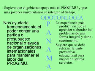 Me motivó a trabajar el deseo de poder ayudar a otras personas de escasos recursos. Además de aprender acerca de mi profesión. Me ha impactado el grado de necesidad y de atención socioeconómico de los pueblos de nuestro país. Melissa Navarro Ch ., 5to año, ODONTOLOGÍA, Universidad de Panamá, 5 años trabajando en AISMe motivó a trabajar el deseo de ayudar a personas de escasos recursos que no logran obtener el servicio que prestamos. Me impactó el ver el agradecimiento de las personas a quienes se les lleva la asistencia. Randold A. Binns , 5to año, ODONTOLOGÍA, Universidad de Panamá, 4 años trabajando en AIS.Me motivó a brindar mis servicios las necesidades de las comunidades y el convivio con estos y los compañeros de diversas disciplinas. |