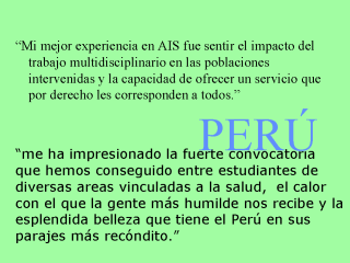 César Augusto Jesús Henríquez Camacho , MEDICINA HUMANA 7mo año, Universidad Peruana Cayetano Heredia, 3 años trabajando en AIS, cajhc@usa.netLo que me motivó a trabajar en AIS fue el trabajo rural e investigación. Para mejorar el trabajo de AIS se debe mejorar la difusion del trabajo rural en nuestras universidades y sensibilizando a la sociedad y a las poblaciones sobre las verdaderas motivaciones de AIS. Asimismo afianzar nuestros lazos con otras instituciones para mejorar la eficiencia del trabajo multidisciplinario Carlos Guillen Astete , MEDICINA HUMANA, 7mo año, Universidad Peruana Cayetano Herediatrabajando en AIS 4 años, 03905@upch.edu.pe Inicialmente por simple curiosidad, y posteriormente curiosidad científica epidemiológica fue lo que me motivaron a integrarme en el trabajo de AIS. Considero importante el hacer que este tipo de programa se haga parte de la currícula regular de la carrera de MEDICINA |