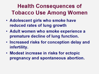 non-smokers and may experience more menopausal symptoms. Women who quit smoking before or during pregnancy reduce the risk for adverse reproductive outcomes, including conception delay, infertility, preterm premature rupture of membranes, preterm delivery, and low birth weight. Postmenopausal women who currently smoke have lower bone density than do women who do not smoke. Also women who currently smoke have an increased risk for hip fracture compared with nonsmoking women. The association of smoking and depression is particularly important among women because they are more likely to be diagnosed with depression than are men. Exposure to environmental tobacco smoke is a cause of lung cancer among women who have never smoked and is associated with increased coronary heart disease risk. |