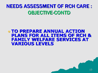 | CONCEPT OF ACTION PLAN IS A NOVEL AND IDEAL CONCEPT SPECIFIC TO THIS INNOVATIVE APPROACH OF NEEDS ASSESSMENT OF RCH SERVICES. IN NO OTHER SECTOR SUCH A CONCEPT IS PRACTISED AND APPLIED. IN FACT PROCESS OF PREPARATION OF ACTION PLANS UNDER RCH PROGRAM IS THE BASIC TOOL OF MEASURING OF QUALITY OF SERVICES AND OF DEMAND-DRIVEN ESTIMATES OF CLIENTS’ OR THE CITIZENS’ NEEDS OF RCH CARE IN RURAL AREAS. |
