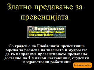 проектот ( Supercoursе-проектот е основан од Националната медицинска библиотека, NIH, како библиотека на предавања за превенцијата и јавното здравство, базирани на интернет, кои бесплатно ги користат 10,000 членови на Глобалната здравствена мрежа од 151 земја. Ние го развивме “Златното предавање за превенцијата” за да илустрираме и да потсетиме на улогата на превенцијата во создавањето и одржувањето на нашата поздрава планета. Забелешка: “send this lecture to a friend” командата работи според PowerPoint slide show модалитетот Оваа лекција е создадена од Faina Linkov, MPH со помош на групата на Supercourse во Pittsburgh, PA и на Глобалната здравствена мрежа (ГЗМ) Подготовка и превод: Проф. Д-р. Елисавета Стикова |