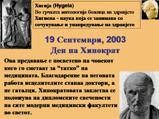 Кратка биографија на Хипократ (Hippocrates) Хипократ, (460-377? п.н.е.) е исклучителен медицински писател од Грција. Малку се знае за неговиот живот, со исклучок дека бил доктор на островот Cos, дека припаѓал на најинтелектуалниот период од животот на Грција и дека бил едноставно ослободен од суеверие. Му се припишуваат преку осумдесет расправи, но денес се смета дека некои од нив се пишувани од други, кои го позајмиле неговото име и репутација. Неговите собрани дела се вкупно десет томови - Енциклопедија за медицина и хирургија, како што тоа тогаш се нарекувало. Хипократ се нарекува татко на научната медицина. Не верувал во чудни болести и излекувања. Тој сметал дека правилната исхрана е неопходна за здравјето и дека климата има длабоко влијание врз човековиот дух и здравје. Тој умрел во Thessaly, во длабока старост. Во Грција, 19 септември се слави како Ден на Хипократ. Ние преддлагаме Денот на Хипократ да се слави во целиот свет како прослава на превенцијата, Светски ден на превенцијата, кога сите ќе можеме да работиме заедно на превенцијата на болестите. На 19 септември 2003 година, ние сакаме да стапат во “брак” медицинските концепти на Хипократ и превентивните концепти на грчката божица на здравјето Хигија (Hygeia). Хигија е божица на доброто здравје, придружувана од нејзиниот татко Асклепиј (Asklepios), како и од Афродита (Aphrodite), која ја претставува превенцијата на болеста. “Заедницата” на Хипократ и Хигија може исто така да претставува две форми на енергија Yan & Yin. За дополнителни информации за Хипократ, посетете: http://www.allsands.com/Science/hippocratesbiog_rtb_gn.htm Овој слајд го направи Глобалната здравствена мрежа на тимот на Supercourse |