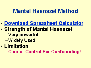 | The Mantel Haenszel Method is a widely used method to calculate stratified summary effects. In this tutorial, a spreadsheet calculator is provided to calculate the summary effect from a group of studies. Ideal for a variety of study designs including RCTs. However, calculation of summary effect using the Mantel Haenszel Method needs a data matrix that can be entered into a 2*2 matrix. Besides, it cannot control for the effects of confounding factors. |