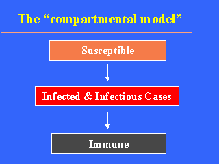 In relation to many directly transmitted infections, the starting point is often the "compartmental model" (slide). According to this, all individuals of a population belong to one of three categories or "compartments": a/ susceptible, b/ infected and infectious, and c/ recovered and immune.