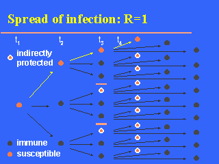 slides 5-7. Here we have: R0 = 3, R = 1, (S/N) eq = 1/3, and (I/N)eq = PC = 2/3.In words: this microorganism in this population would be transmitted, on average, to three susceptibles per each infected case should all members of the population be susceptible (R0=3); on average, the infection is actually transmitted, to only one susceptible person per infected case (R=1); in this state of equilibrium, one out of three people are susceptible ((S/N) eq = 1/3) and two out of three are immune ((I/N)eq = 2/3); if we could achieve a vaccination level higher than 2/3 we would be able to eventually eradicate the microorganism (PC = 1 - (1/R0) = 1 - (1/3) = 2/3 = 67%). |