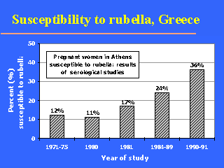 | As a consequence, the proportion of pregnant women susceptible to rubella increased during the 1980s, as shown by serological studies carried out in Athens. |