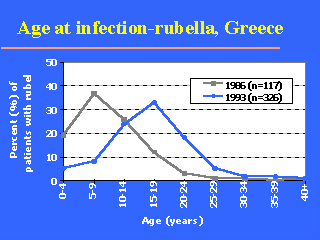 epidemic in Greece which mostly affected adolescents and young adults. There was a definite shift in age at infection, and the age-specific incidence of rubella among 15+ year olds was higher in 1993 compared to previous epidemic years. |