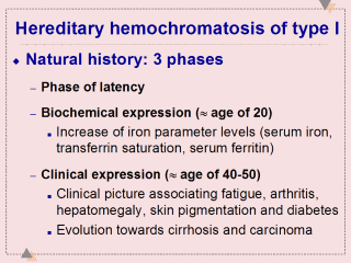 - a phase of clinical expression, which appears later during adulthood, generally around the age of 40 in males and later in females, around the age of 50, because of the protective effects of menstrual blood loss and pregnancies . The clinical signs associate fatigue, arthritis, hepatomegaly, skin pigmentation and diabetes and can progress towards cirrhosis and carcinoma.
